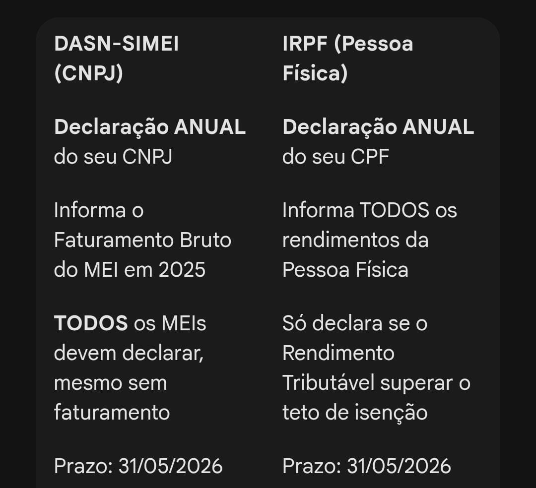 É fundamental entender que, como MEI, você tem duas obrigações anuais diferentes, embora com o mesmo prazo: